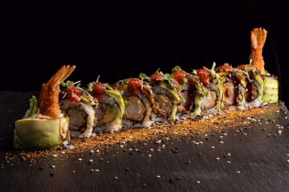 [ Tempura reje og avocado toppet med flammegrillet tun,