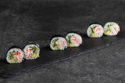 [ Tempura asparges, agurk toppet med avocado, sesam
